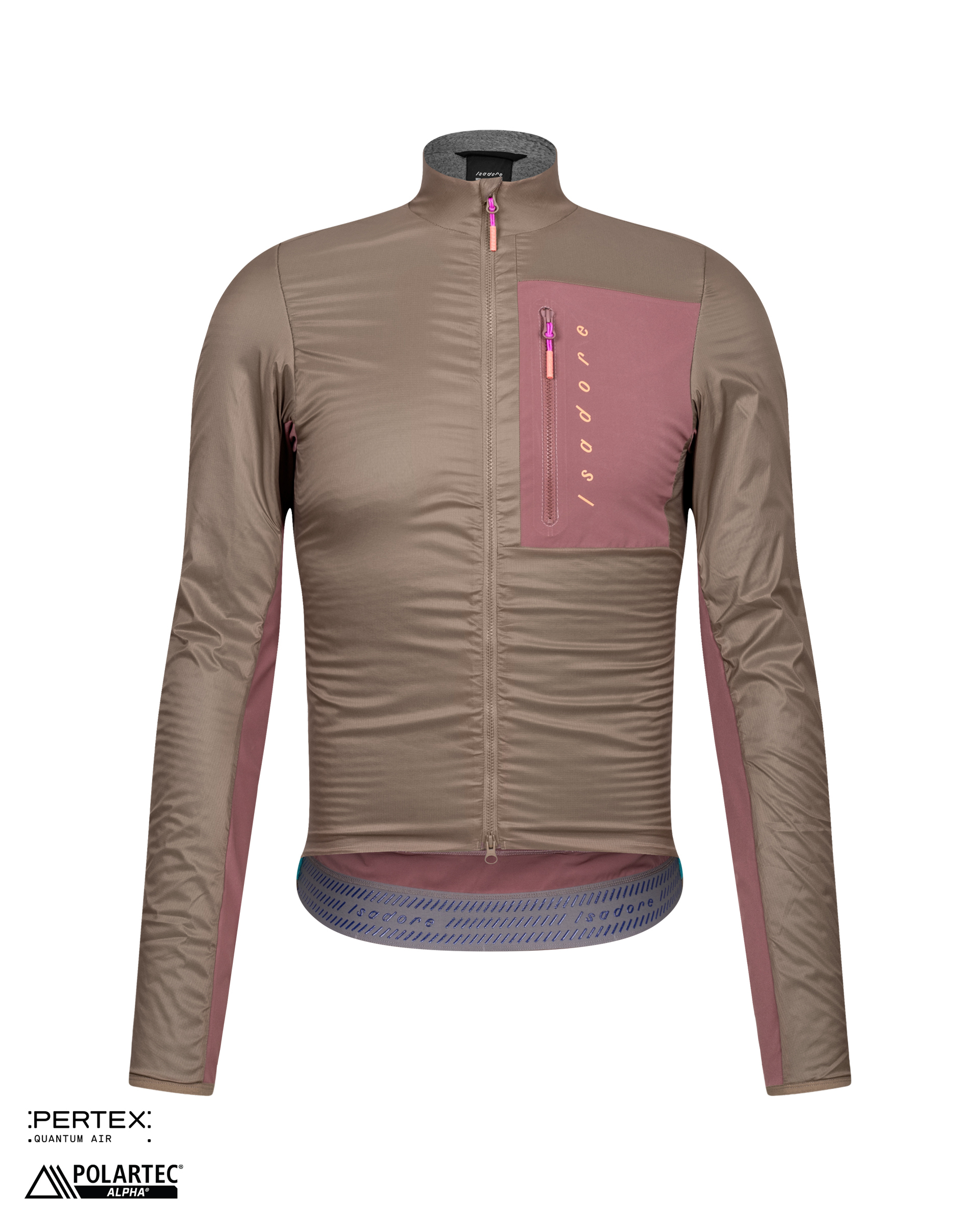 L’avant, les épaules et le haut des manches sont fabriqués en matériau fonctionnel Pertex® Quantum Air et sont recouverts d’une couche d’isolation Polartec® Alpha® Direct à l’intérieur. La composition du maillot est complétée par un tissu recyclé de haute densité au niveau du dos et à l’intérieur des manches afin d’éviter les fuites de chaleur indésirables. Le Polartec® sèche rapidement et se caractérise par une excellente respirabilité et un poids léger. De plus, la couche extérieure est traitée avec une technologie sans fluor qui augmente la faculté du matériau à repousser l’eau et la saleté. Les trois grandes poches arrière sont complétées par une poche zippée et une poche zippée au niveau de la poitrine pour maintenir leur contenu accessible et en sécurité. Le caractère durable de la production de la veste est souligné par les matériaux recyclés des fermetures à glissière bidirectionnelles, des tirettes de fermetures à glissière et du silicone de la bande entourant l’ourlet inférieur pour une meilleure isolation.